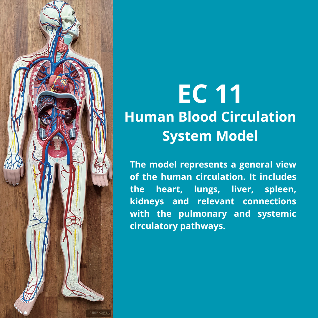 EC11 Human Blood Circulation System Model adalah model anatomi sistem peredaran darah manusia yang menampilkan gambaran umum sirkulasi tubuh secara lengkap. Model ini mencakup jantung, paru-paru, hati, limpa, ginjal, serta hubungan keduanya dengan jalur sirkulasi pulmonal (jantung–paru) dan sirkulasi sistemik (jantung–seluruh tubuh).