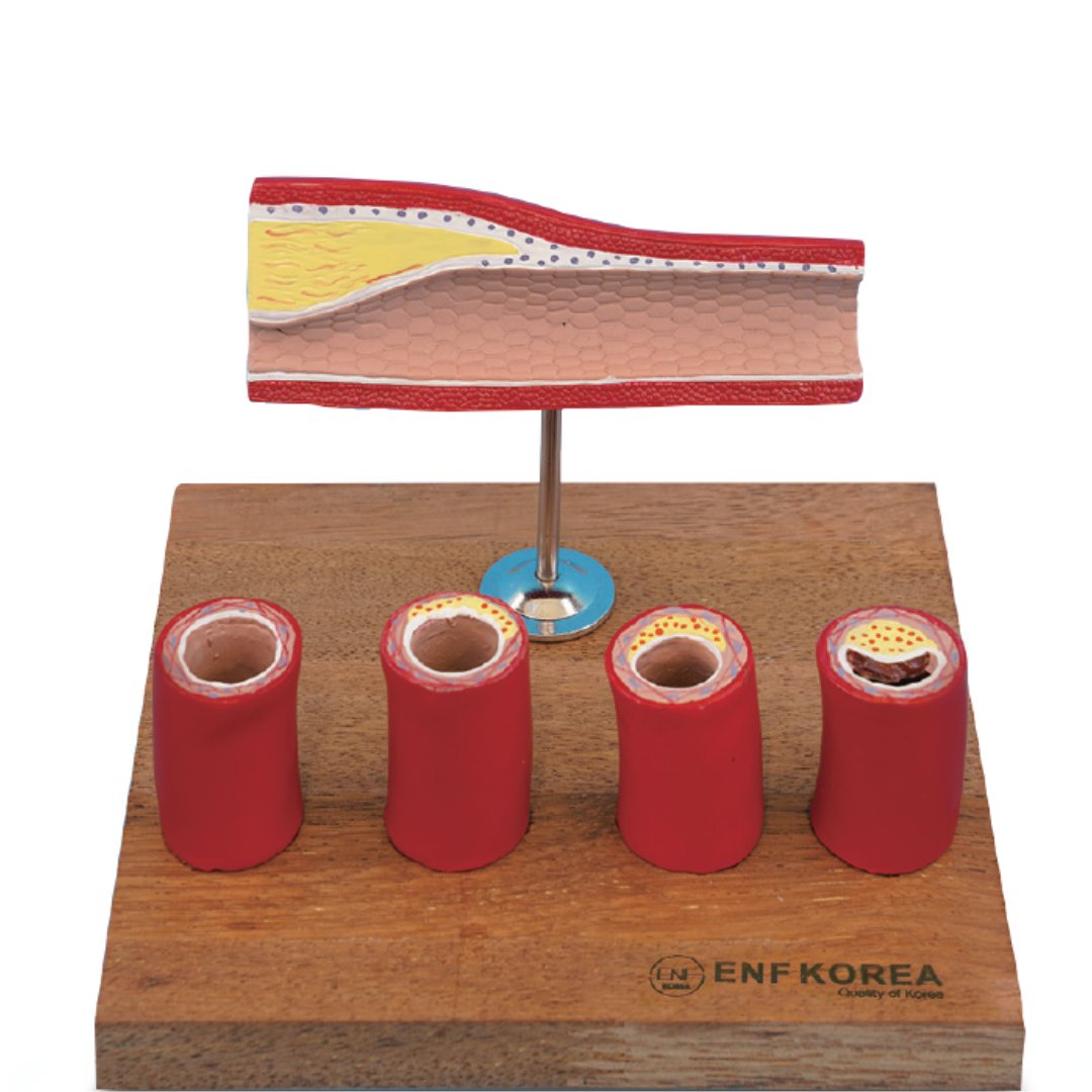 Artery Model with 4 Cross Section adalah model anatomi pembuluh arteri yang dirancang untuk menunjukkan perkembangan penyakit arteri secara bertahap. Satu segmen arteri ditampilkan dengan 4 penampang melintang (cross section) yang menggambarkan: kondisi arteri normal, awal penumpukan plak, penyempitan lumen yang lebih lanjut, hingga tahap penyakit arteri yang lebih berat.