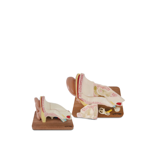 Model ini menampilkan secara lengkap telinga luar, telinga tengah, dan telinga dalam, termasuk struktur penting seperti ossicles (tulang pendengaran), koklea (cochlea), dan kanalis semisirkularis. Dengan pembesaran yang signifikan, model ini sangat membantu dalam memahami mekanisme pendengaran dan keseimbangan.